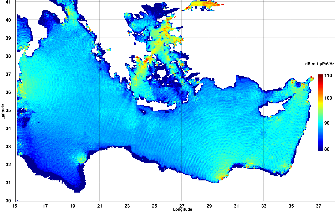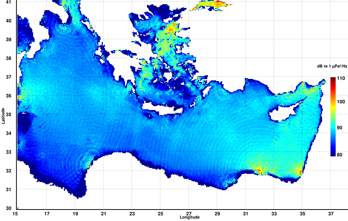 Predicted spectral noise levels, in dB re 1 μPa²/Hz, for the frequency of 100 Hz
