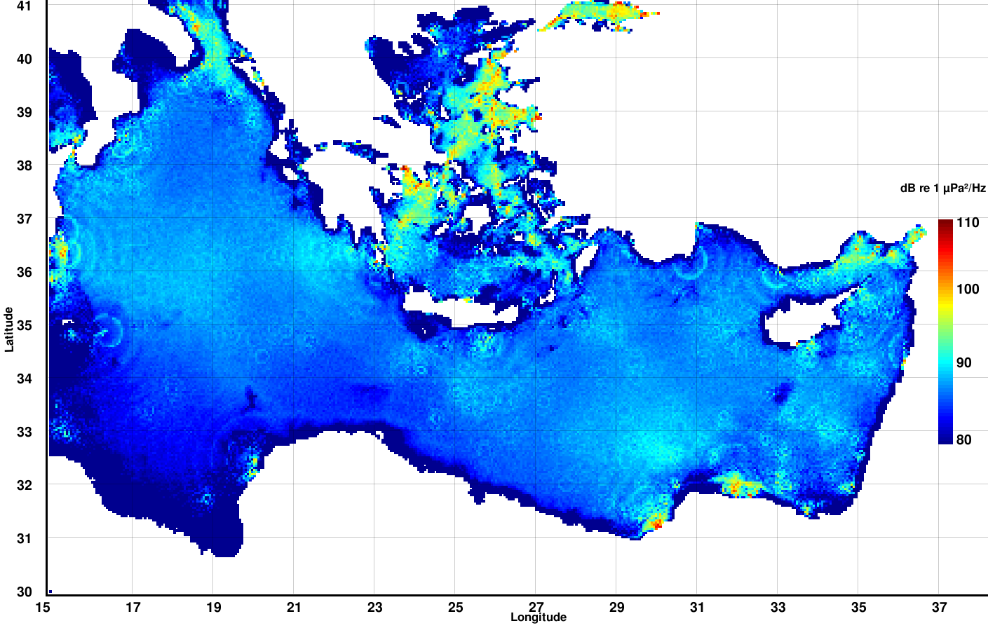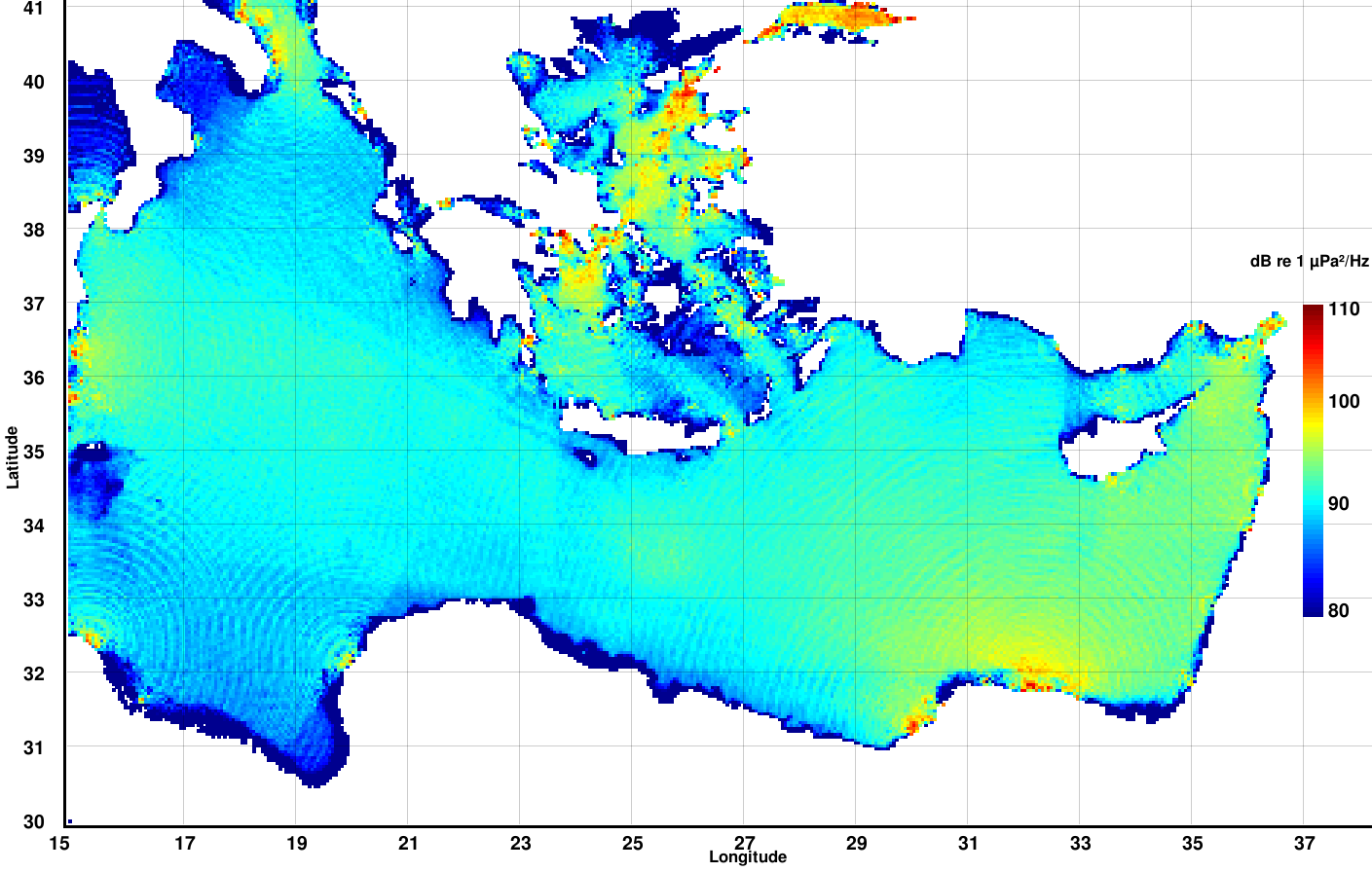 Predicted spectral noise levels, in dB re 1 μPa²/Hz, for the frequency of 100 Hz